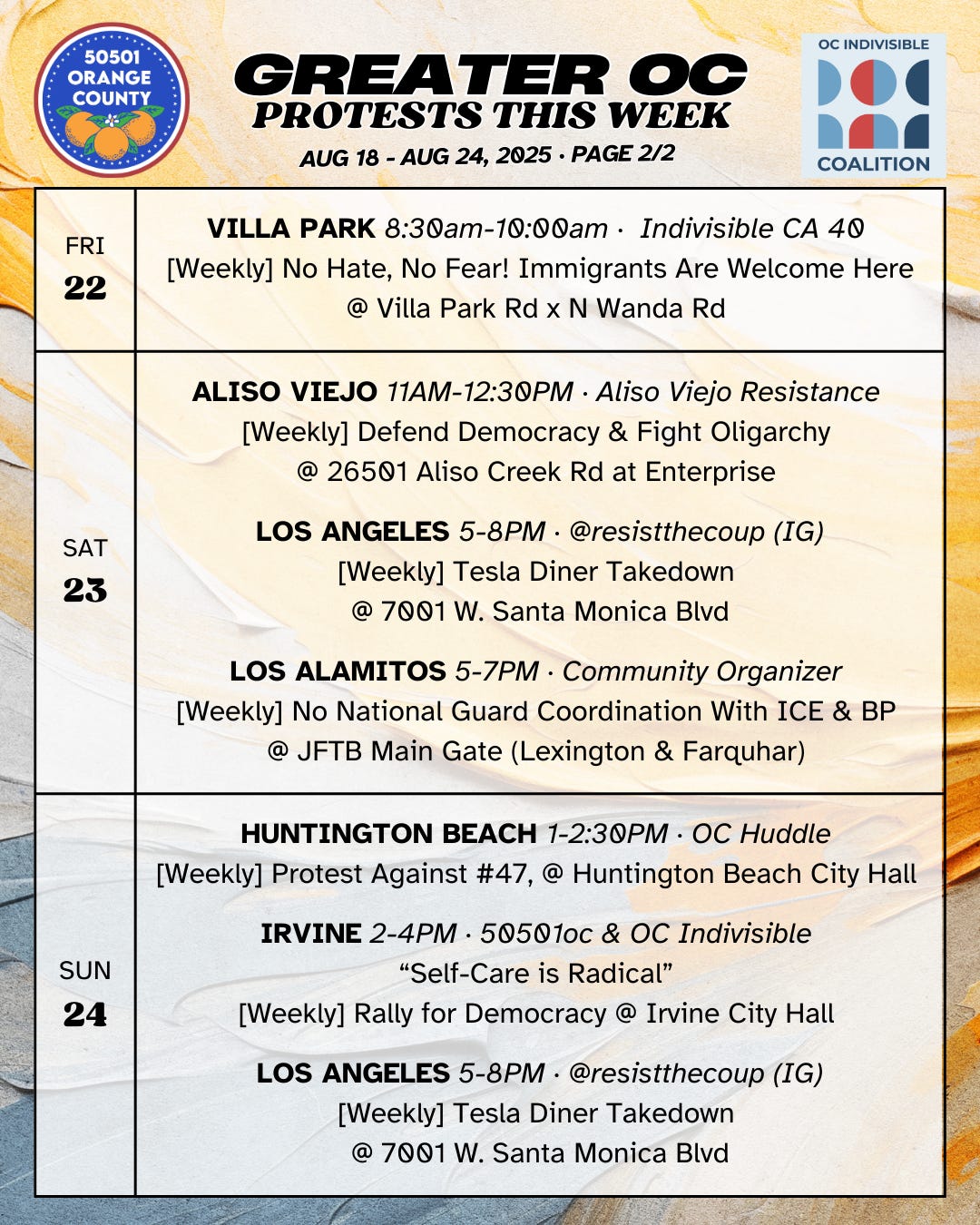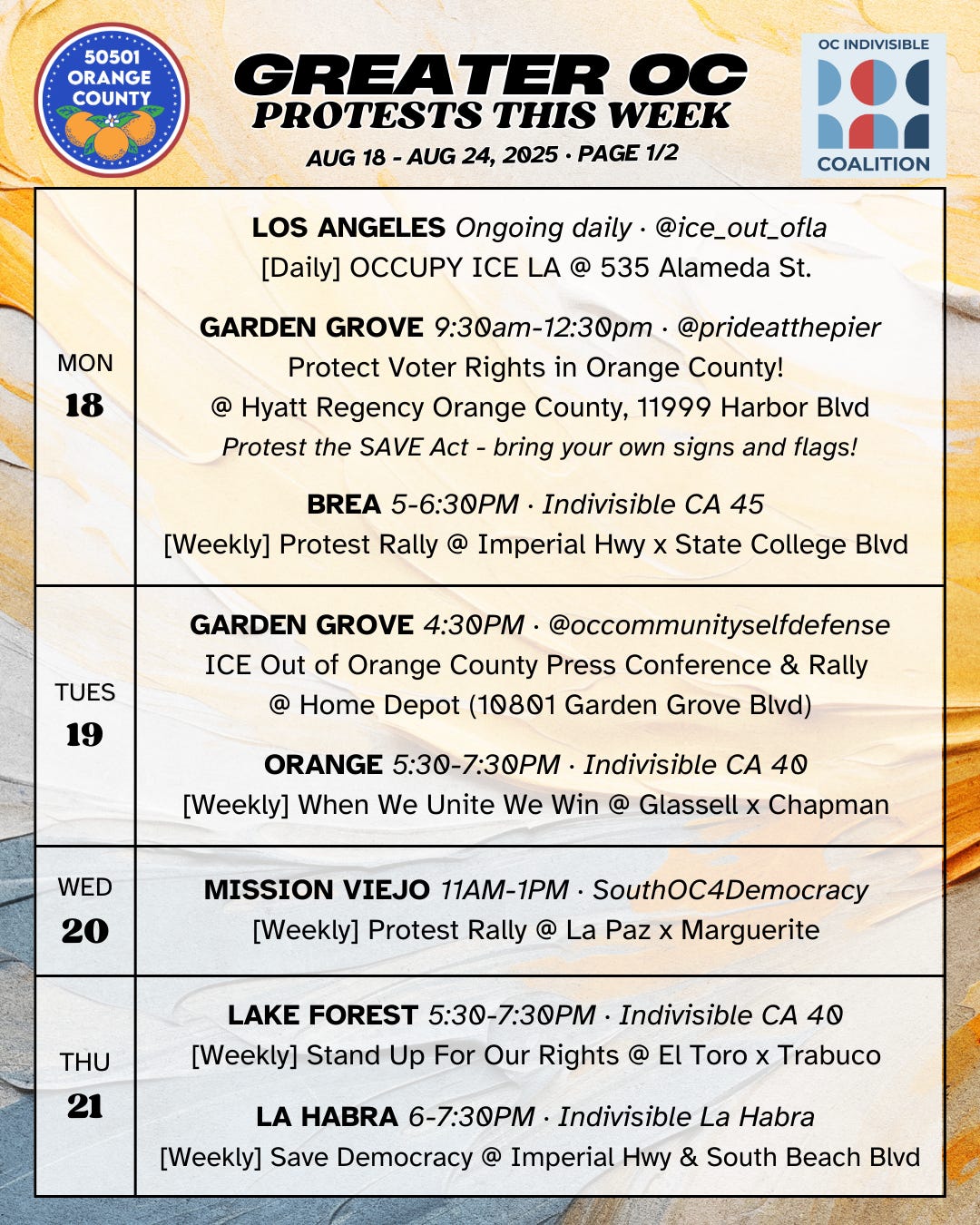 Dear Greater Orange County: Looking for more protest opportunities this week? We have options for you! (Aug 18 - Aug 24, 2025)
