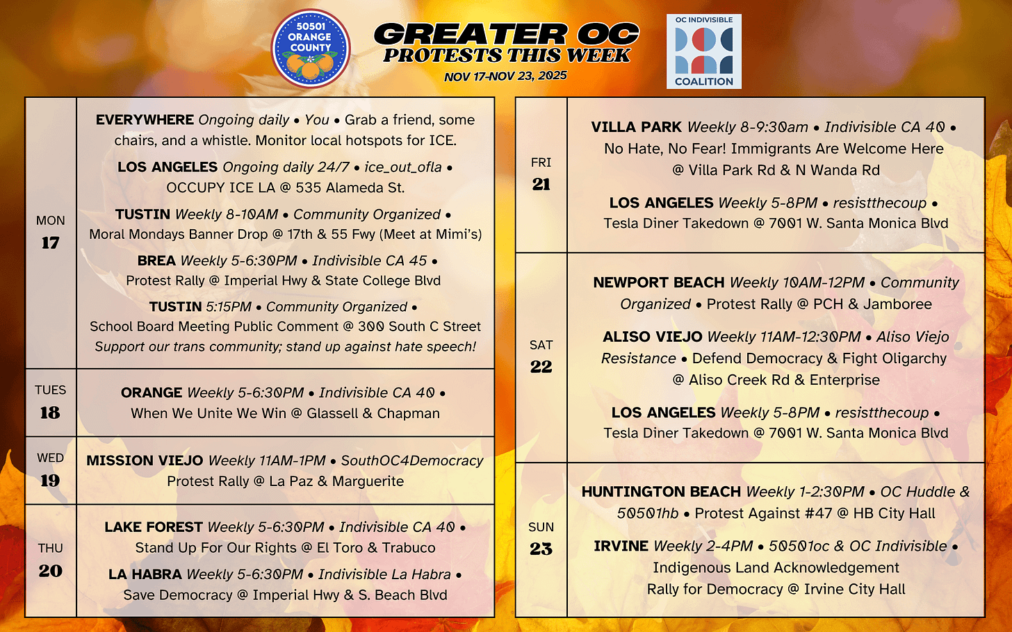 📅 Weekly OC Protests & Actions (Nov 17–Nov 23, 2025)