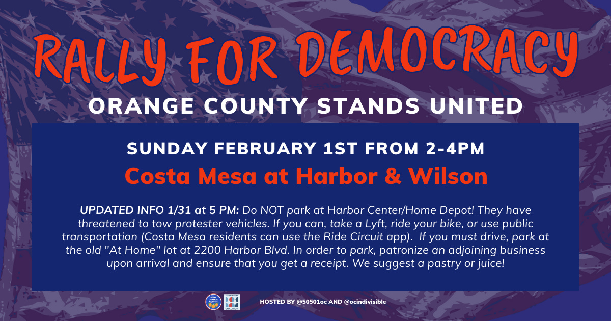 IMPORTANT Parking Updates: Sunday Feb 1st “Rally for Democracy” in Costa Mesa