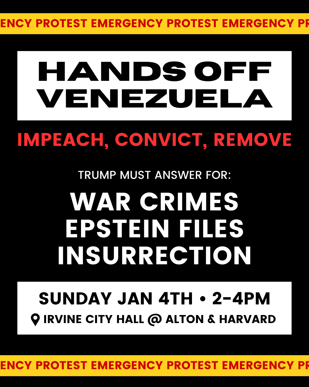 Rain or shine this Sunday January 4th, we will be rallying to demonstrate public pushback against the immoral and illegal actions of the sham Trump administration in carrying out an unauthorized military strike in Venezuela and declaring their intent to “run the country”.