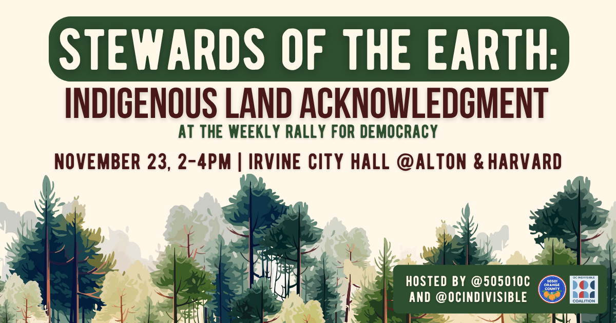 This Sunday 11/23, we are hosting a land acknowledgment at the Irvine Rally for Democracy. Our indigenous community member Mazatl will be leading the ceremony and we would like to compensate him for his time and work! Volunteers have helped with crowdfunding, but we would ideally like to get over $150 total if possible and are currently short $70. If you are able to help out, please send funds via Zelle to amyinmv@proton.me.