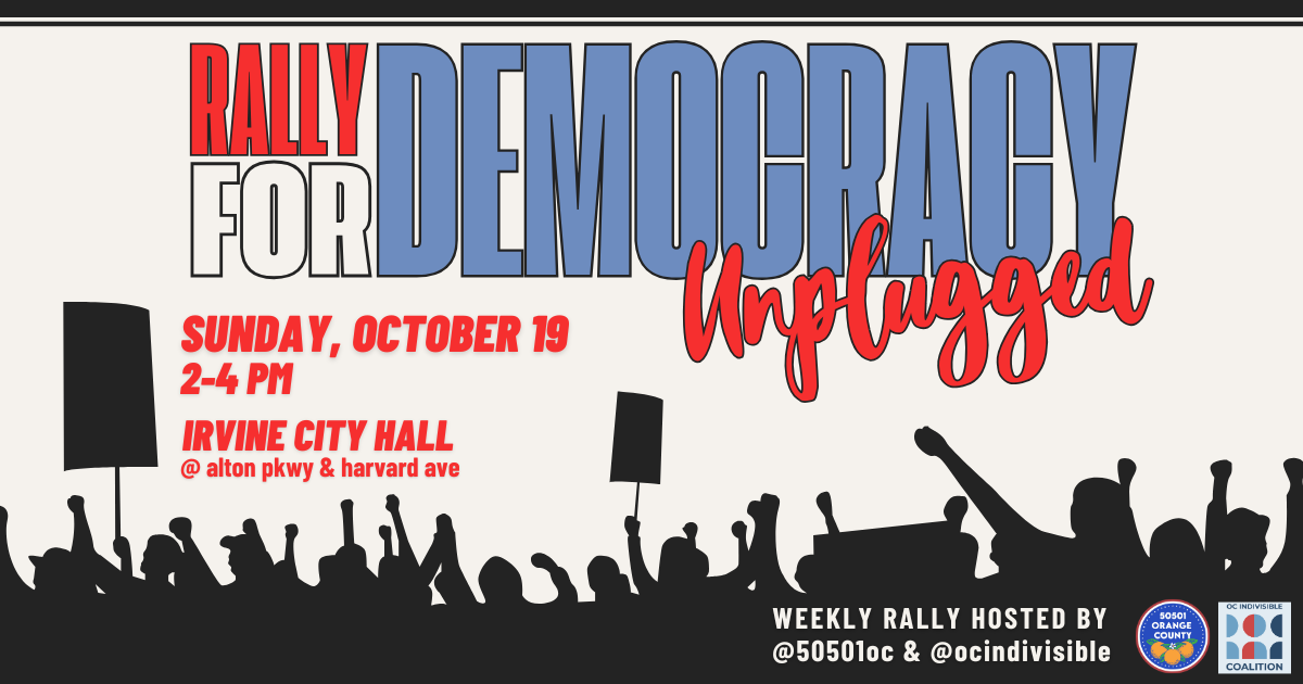 This Sunday October 19th, join OC Indivisible Coalition & 50501 Orange County at Irvine City Hall from 2-4pm for our weekly Rally for Democracy! Because of our big day on the 18th, Sunday’s rally will be a scaled back version of what we normally do. Expect crossing guards and music, but no speaking program.