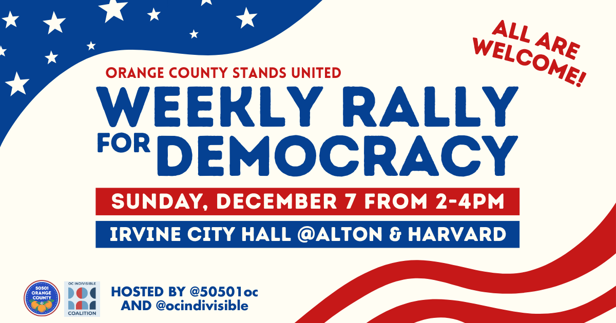 This Sunday December 7th, join OC Indivisible Coalition & 50501 Orange County at Irvine City Hall from 2-4pm for our weekly Rally for Democracy!