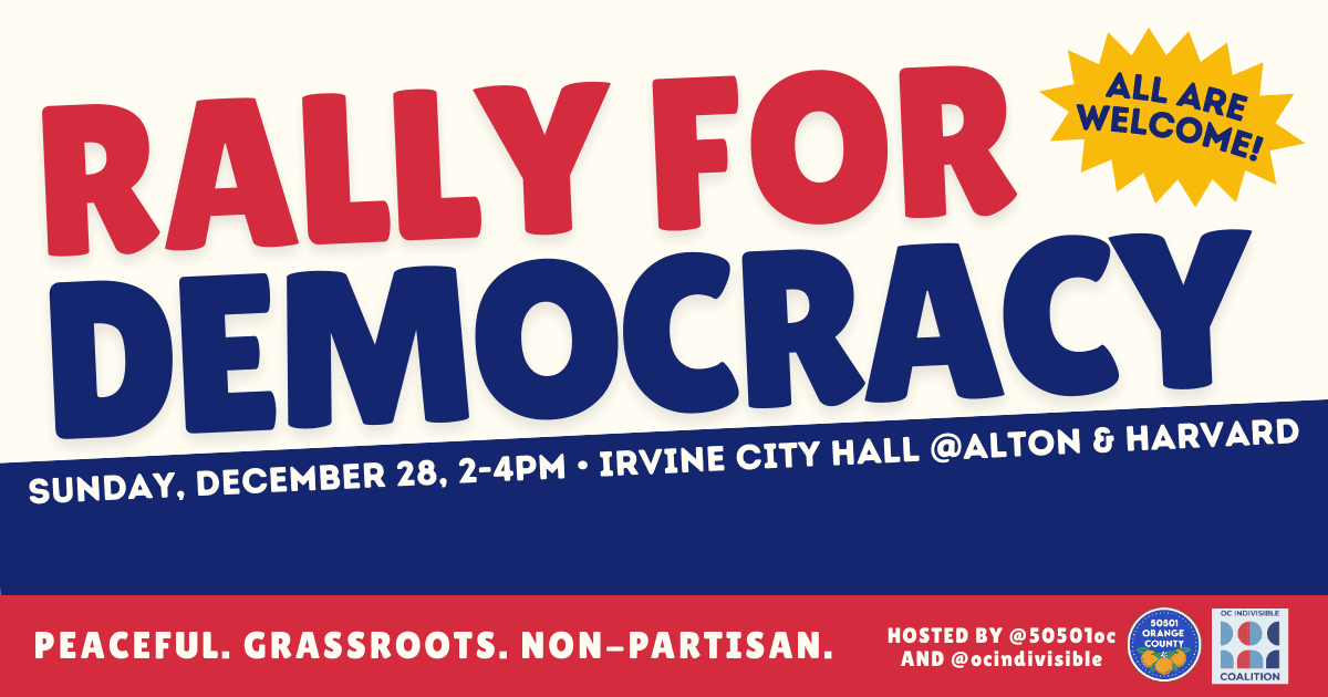 This Sunday December 28th, join OC Indivisible Coalition & 50501 Orange County at Irvine City Hall from 2-4pm for our weekly Rally for Democracy!